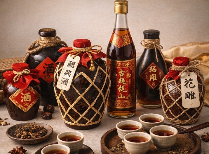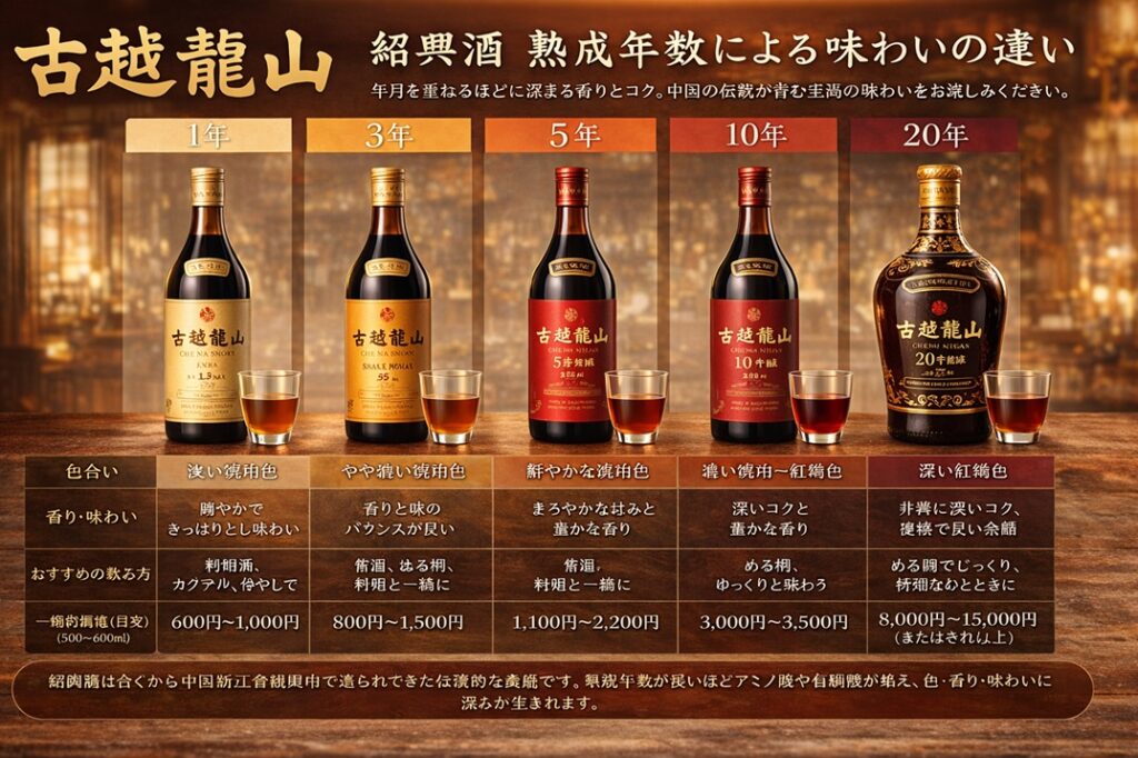 この画像は、中国を代表する伝統酒である紹興酒の熟成年数による味わいの違いを分かりやすく紹介したものです。紹興酒は中国浙江省紹興市で古くから造られてきた黄酒の一種で、米や麦麹を原料に長期間熟成させることで独特の香りと深い味わいを生み出します。一般的に熟成年数が長くなるほど色は濃い琥珀色から紅褐色へと変化し、香りやコクもより豊かになっていきます。1年酒は軽やかでさっぱりとした味わいが特徴で、料理酒としてもよく利用されます。3年酒になると香りと味のバランスが整い、食事と合わせやすい紹興酒として親しまれています。5年酒は紹興酒らしいまろやかな甘みと豊かな香りが感じられ、飲みやすさと風味のバランスに優れています。さらに10年酒は熟成による深いコクと芳醇な香りが特徴で、ゆっくり味わう上質な紹興酒として評価されています。そして20年酒は長期熟成によって非常に深い味わいと複雑な香りを持つ高級酒で、特別な席や贈答品としても人気があります。このように紹興酒は熟成年数によって味わいが大きく変化し、その違いを楽しめることが大きな魅力の一つです。